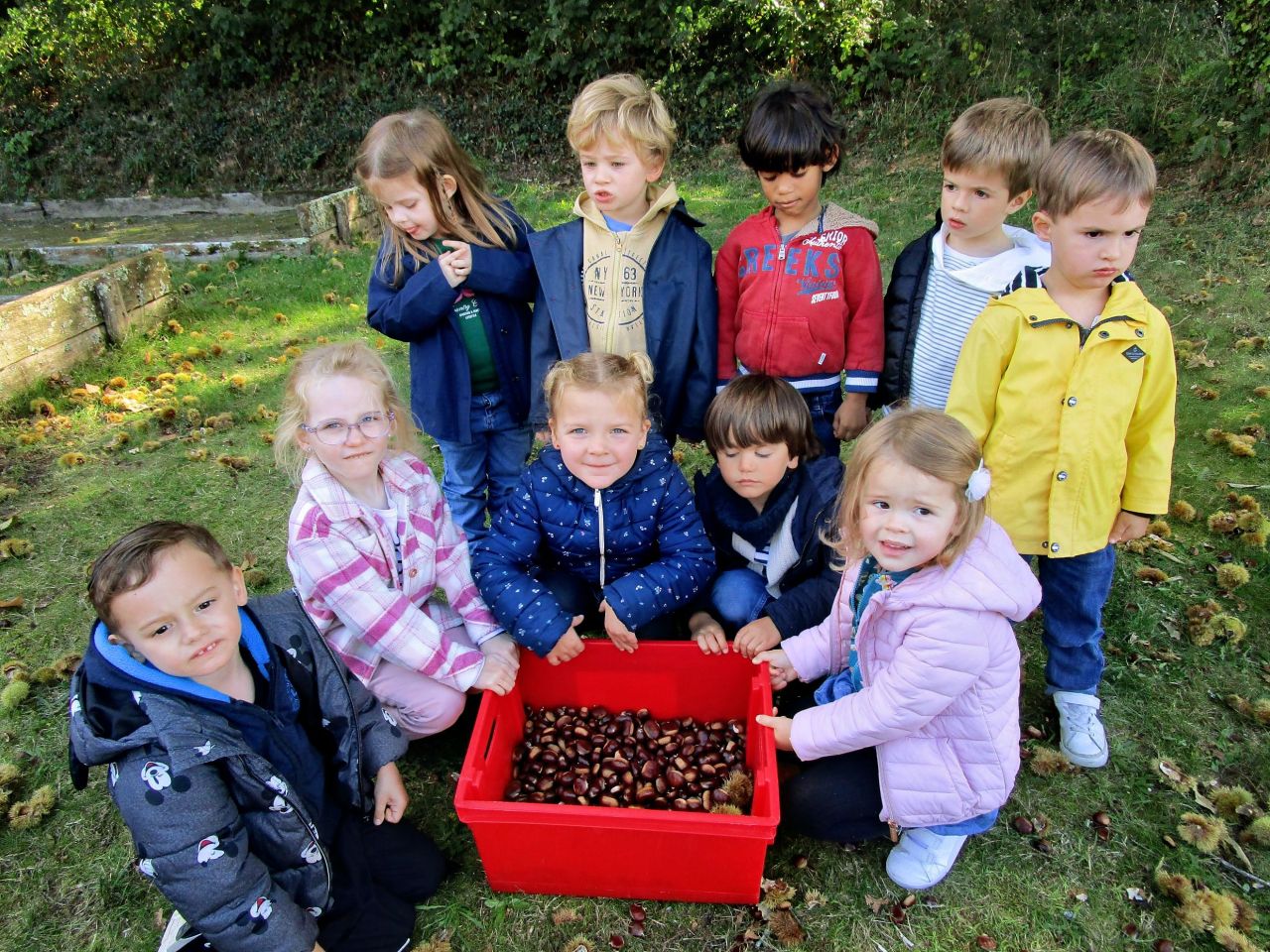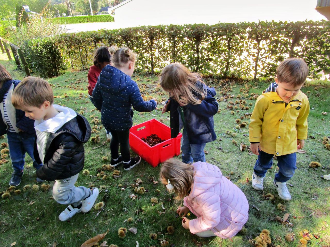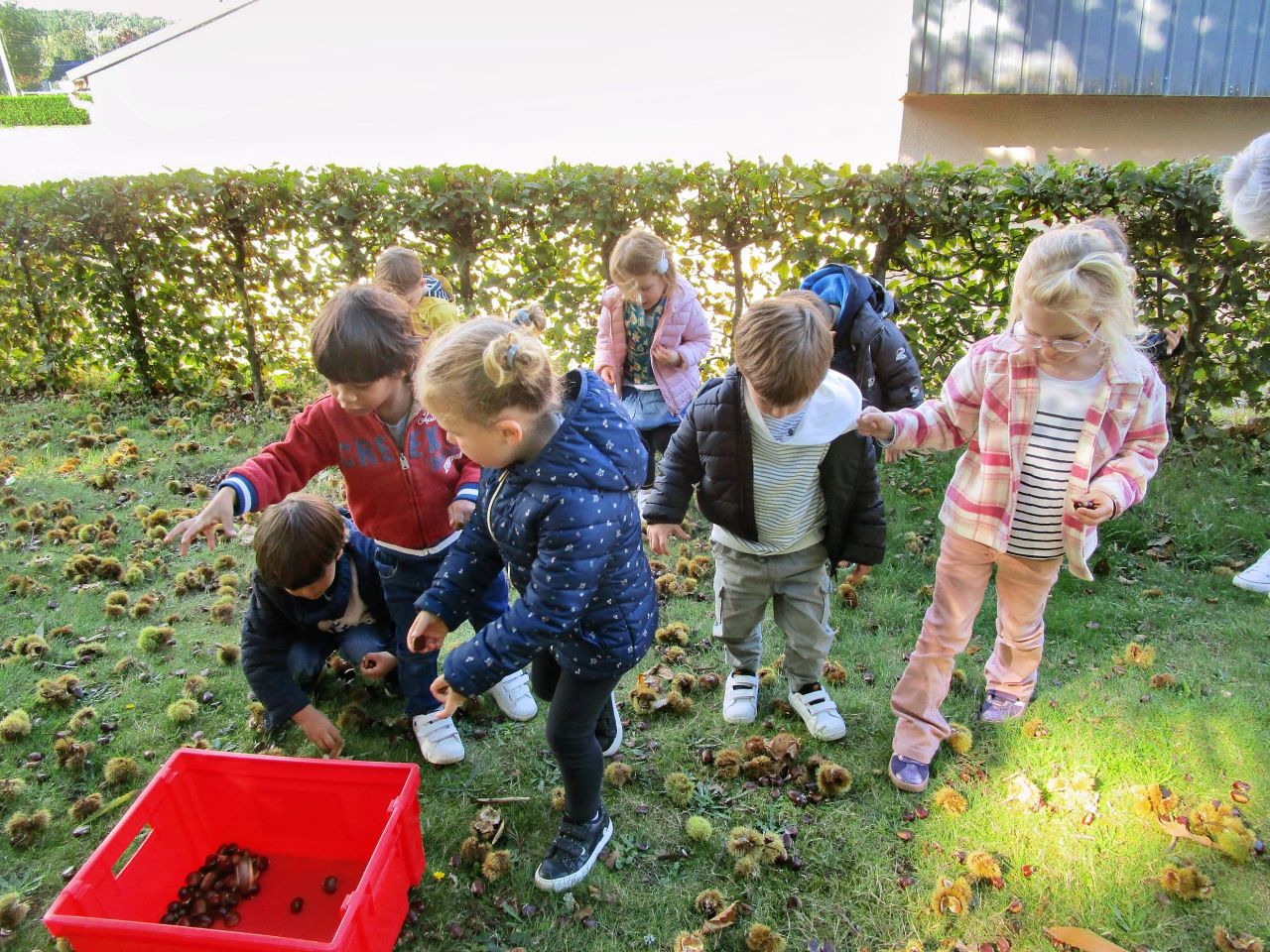 Un autre jour, nous avons ramassé des châtaignes. Les bogues étaient tombées dans l'herbe, sous le châtaignier. Certaines étaient ouvertes mais d'autres étaient encore fermées. Il fallait les ouvrir avec les pieds : c'était plus difficile. La récolte a été très bonne.