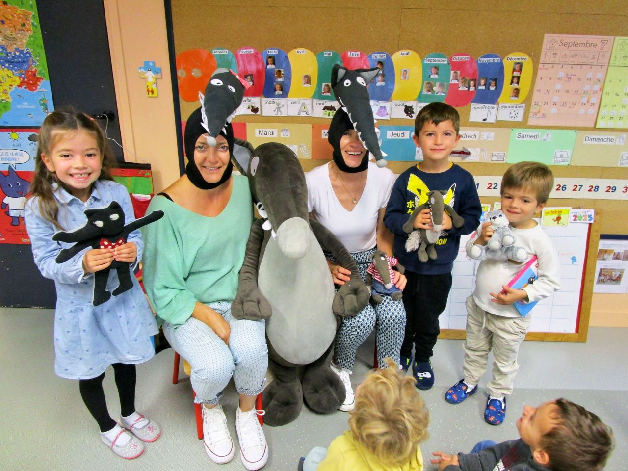 Vendredi 3 octobre, les enfants qui avaient un loup en peluche l'ont apporté. Patricia et Sylvanie ont mis un masque de loup et louve. C'était rigolo.