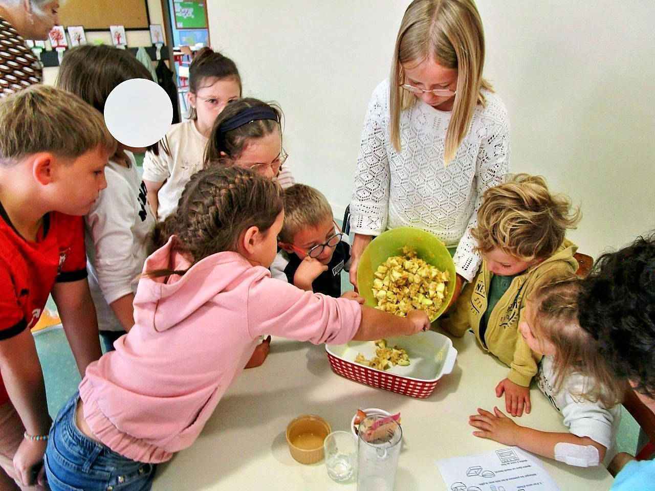 Jeudi 16 octobre, nous avons fait de la compote de pomme. D'abord, nous avons lu la recette. Les GS ont épluché une pomme avec un économe. C'était un peu difficile. Et ils l'ont coupée par la moitié avec un couteau. Les PS-MS ont coupé les pommes en petits morceaux.