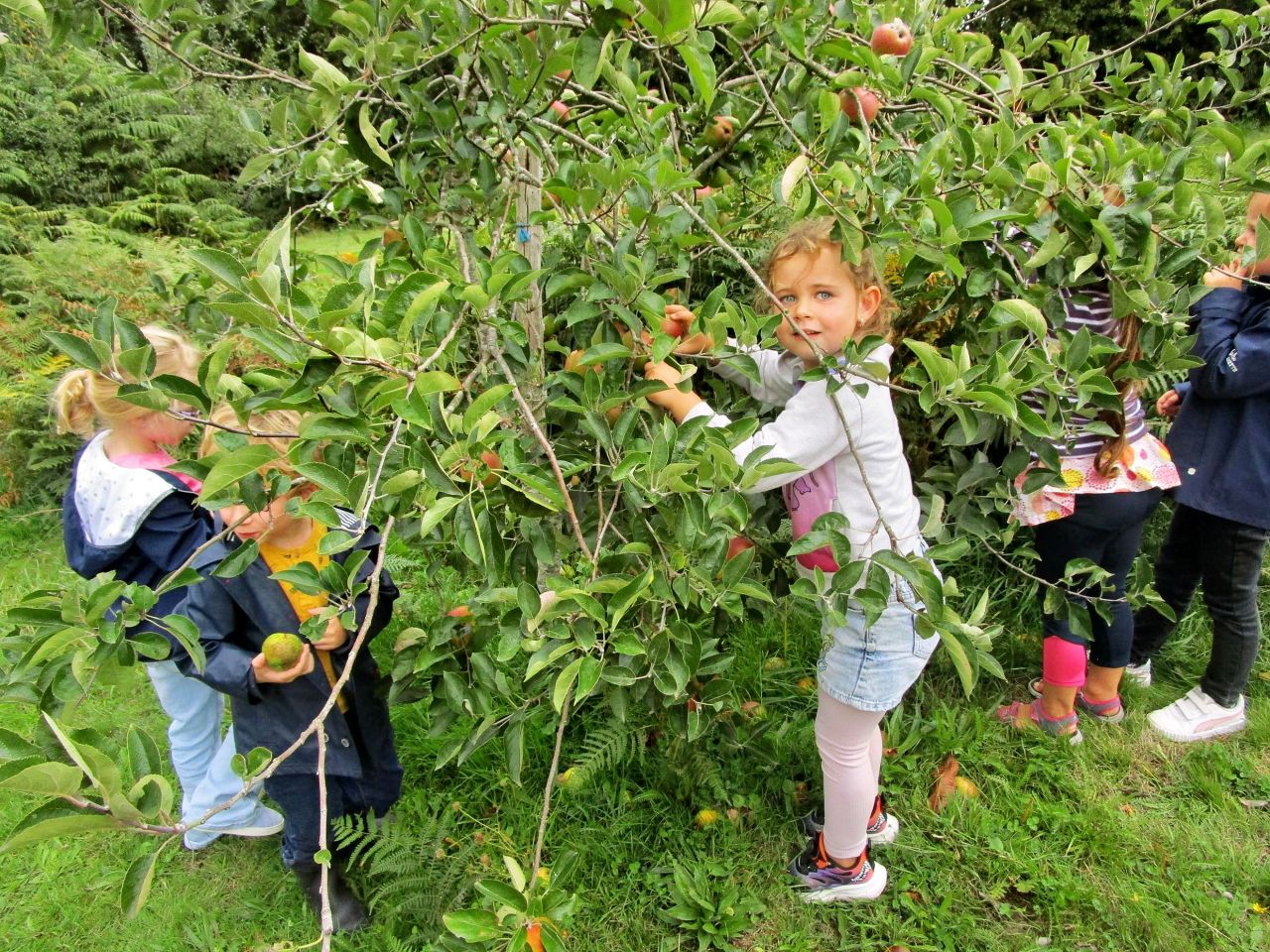 En septembre, nous avons observé le pommier. Les pommes que nous avons vues grandir au printemps ont beaucoup grossi. Après, nous les avons cueillies.